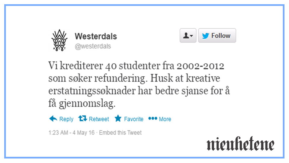 Nå overrasker Westerdals med et fiffig kompromiss på Twitter (se skjermdump). Westerdals vil gå med på å kreditere 40 tidligere studenter – men presiserer at sjansen er større dersom studentene skriver «kreative erstatningssøknader». Dette har satt sinnet i kok hos tidligere studenter. Men kunnskapsminister Torbjørn Røe Isaksen ønsker å se det positive i fagskolens utspill.